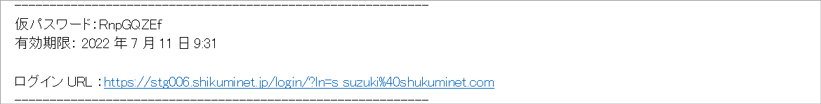 - 仮パスワード発行後に届いた『仮パスワード発行のご案内』メールを参照してください。