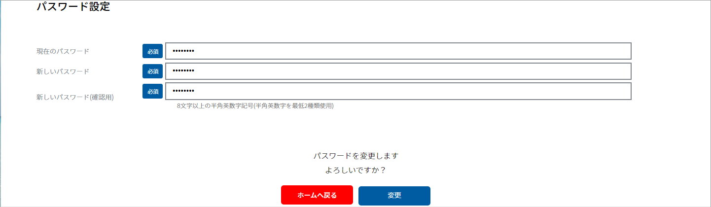 ③『パスワード設定』画面に遷移しますので、「現在のパスワード」「新しいパスワード」を入力し、「変更」をクリックします。