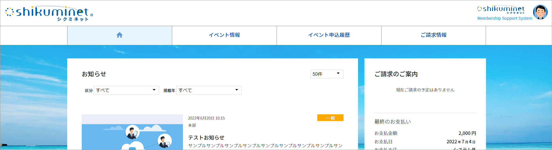①正常にログインが完了すると、会員マイページの『ホーム』画面が表示されます。